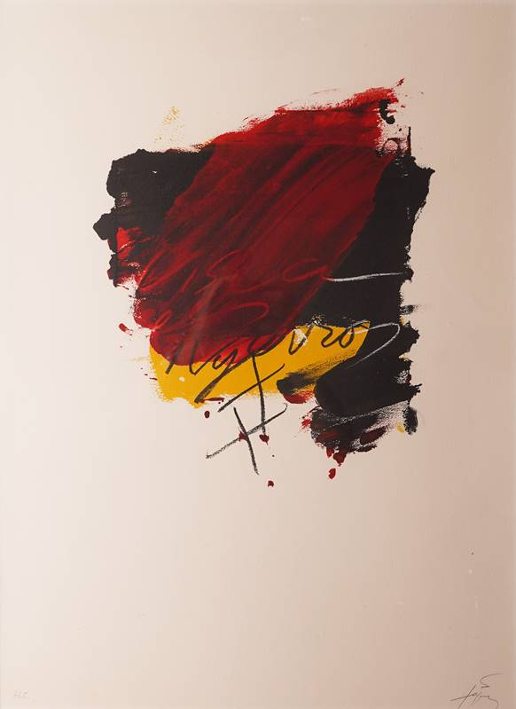 1923 Barcelona - 2012 ebd. Clau, 1973. Blatt 1 aus "La clau del foc". Farblithographie auf Rives. Unten rechts signiert. Unten links bezeichnet H.C. Hinter Glas und Passepartout gerahmt. Bildgröße ca. 35 x 29 cm, Rahmen ca. 81 x 62 cm. Papier ist leicht gebräunt.
