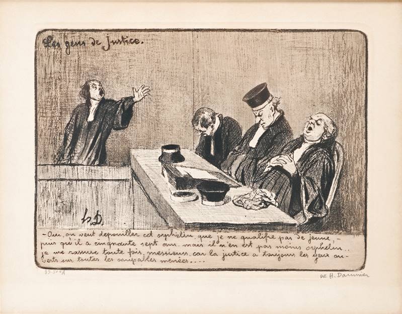 1808 Marseille - 1879 Valmondois. Drei gerahmte Grafiken. Les gens de justice. Im Druck signiert, unten rechts bezeichnet, unten links nummeriert 39/500a. Größe ca. 20,8 x 28,7 cm. Lithographie aus Les gens de justice. Im Druck signiert und nummeriert 1326. Rahmen ca. 38 x 33 cm. Wasserfleck oben links. Lithographie Les Baigneurs. Im Druck signiert. Rahmen ca. 34 x 40 cm.