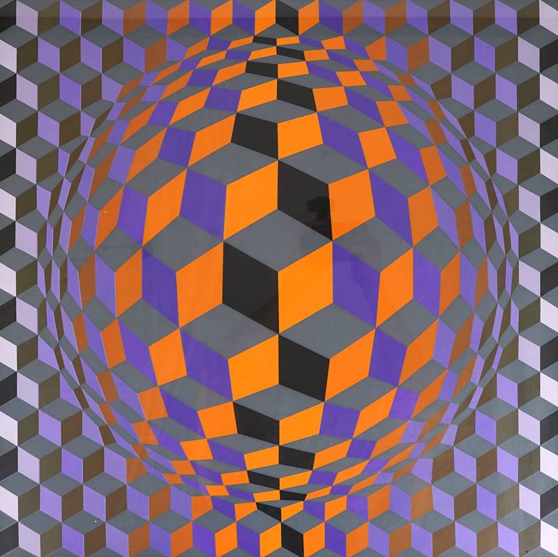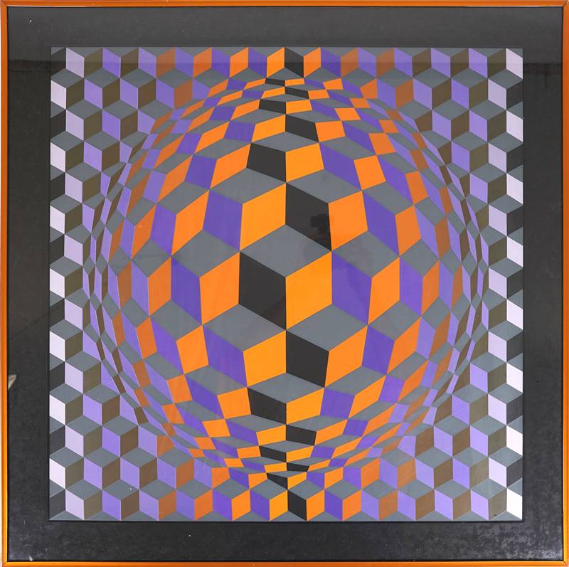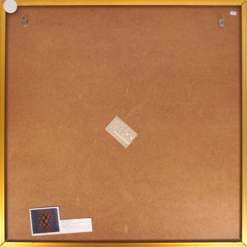 Vasarely, Victor 1906 Pécs - 1997 Paris. Farbserigraphie. Hinter Glas und Passepartout gerahmt. Das Blatt ist nicht signiert. Blattgröße ca. 66 x 66 cm, Rahmen ca. 70,5 x 70,5 cm. Teils minimaler Farbverlust.