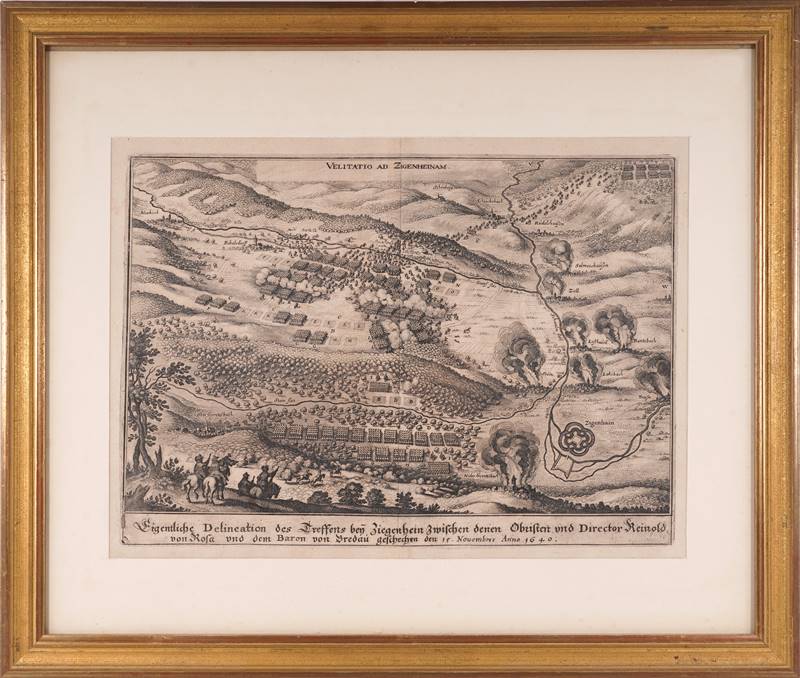 Merian, Mätthäus 1593 Basel - 1650 Langenschwalbach. Kupferstich aus Theatrum Europaeum Bd. IV, 1643. Velitatio ad Zigenheinam. Eigentliche Delineation des Treffens bey Ziegenhein Zwischen denen Obristen vnd Director Reinold von Rosa vnd dem Baron von Bredau geschechen den 15. Nouembris Anno 1640. Mit Bugfalte. Größe ca. 23,5 x 33 cm, hinter Passepartout und Glas gerahmt ca. 39,5 x 47 cm.