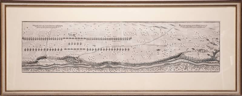 Busch, Cornelius von dem 1616 Utrecht - 1657 in Wolfenbüttel. Zwei Blätter. Militärkarte der Schlacht bei Landsberg 1648. Delineatio aciei qua Sociati Suecorum Gallicorum etc. Kupferstich. Größe ca. 9 x 73 cm, hinter Passepartout und Glas gerahmt ca. 35 x 88 cm. Teils mit Knicken.