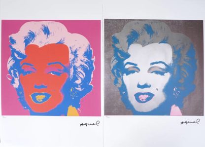1928 Pittsburgh - 1987 New York, nach. Marilyn Monroe. Zwei Offset-Lithografien auf Arches. Unten rechts im Druck signiert, unten links mit Bleistift nummeriert 29/100 und 98/100. Mit Wasserzeichen "Arches France" und Trockenstempel "Georges Israel Editeur" am unteren Blattrand. Verso dreifach gestempelt von der Art Gallery New York, Life Tree Art New York und Leo Castelli New York, sowie ein Hologramm-Aufkleber "verification of authenticity www.grafy.blog". Bildgröße je ca. 37 x 37 cm, Blattgröße je ca. 57 x 38,7 cm.