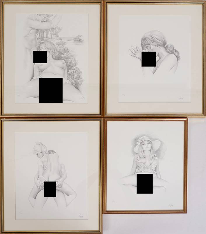 1930 Bordeaux - 2014 Sainte Adèle. Dessins secrets. Vier diverse Offsets auf dünnem, glattem Karton. Jeweils unten rechts signiert und unten links nummeriert jeweils 50/170. Jeweils hinter Glas gerahmt. Größe dreimal ca. 52 x 42 cm, einmal ca. 43 x 35 cm. Aus Gründen des Jugendschutzes wurden Teile der Abbildung hier unkenntlich gemacht. Auf Wunsch lassen wir Ihnen gerne vollständige Aufnahmen des Werkes per E-Mail zukommen.