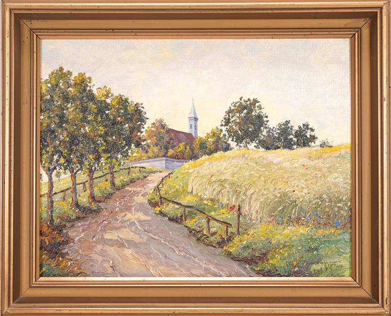 Kammerer, Rolf 1881 - 1961. Furtwanger Künstler. Friedhofkapelle von unten gesehen. Öl auf Platte. Unten rechts signiert und datiert 1935, verso bezeichnet. Größe ca. 27 x 34 cm, Rahmen ca. 33 x 41 cm.