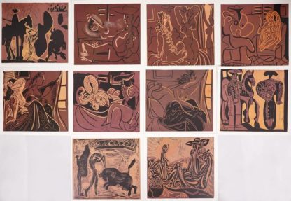 1881 Málaga - 1973 Mougins, nach. 10 diverse farbige Offsets nach diversen Linolschnitten. Jeweils Neuauflage bei Hatje, 1988. "Die Banderillas", "Nach der Weinlese", "Picador und Matador", "Gitarrenspieler und Frau im Sessel", "Frau am Fenster", "Liegende und Picador mit Gitarre", "Zwei Frauen am Fenster", "Drei Frauen", "Schlafende Frau und Gitarrenspieler", "Vor der Tötung des Stieres". Bildgrößen je ca. 27 x 33 cm, max. Blattgröße ca. 31,7 x 35,9 cm.