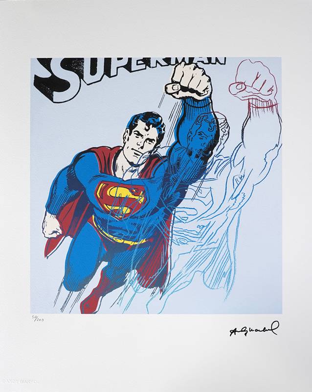 Warhol, Andy 1928 Pittsburgh - 1987 New York, nach. Superman. Offset-Lithografie auf Arches. Unten rechts im Druck signiert, unten links mit Bleistift nummeriert 50/200. Unten links mit Prägestempel lizensiert "© ANDY WARHOL". Verso blauer Stempel "Andy Warhol". Bildgröße ca. 32,2 x 31,8 cm, Blattgröße ca. 50 x 40,3 cm.