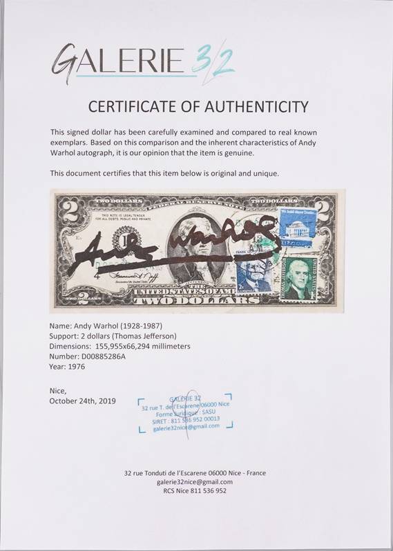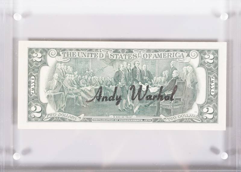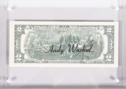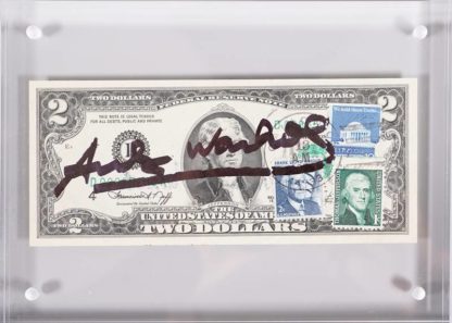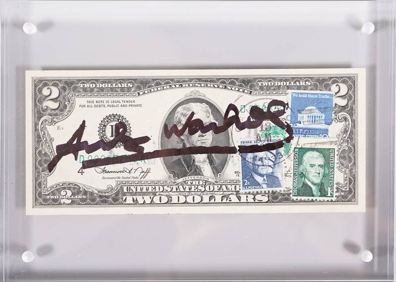1928 Pittsburgh - 1987 New York. 2 Dollars (Thomas Jefferson). Vorderseite schwarze Signatur, sowie gestempelte Briefmarke, verso schwarzer Stempel Andy Warhol. Größe des Scheins ca. 6,6 x 15,5 cm, zwischen zwei Plexiglasscheiben gerahmt ca. 15 x 20,5 cm. Anbei Zertifikat der Galerie 32 mit Seriennummerangabe D00885286A 1976.