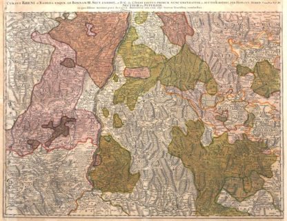 Cursus Rheni a Basilea usque ad Bonnam ... per Homann Hered. Ca. 1760. Altkolorierter Kupferstich. Mit Bugfalte. Hinter Passepartout und Glas gerahmt Größe ca. 47 x 61 cm, Rahmen ca. 68 x 82,5 cm. Teils fleckig, Blatt wurde wohl beschnitten.