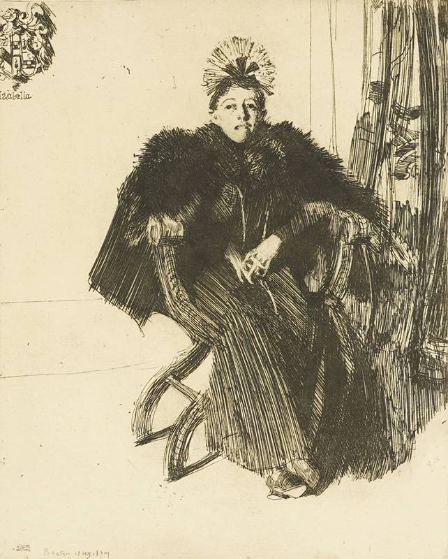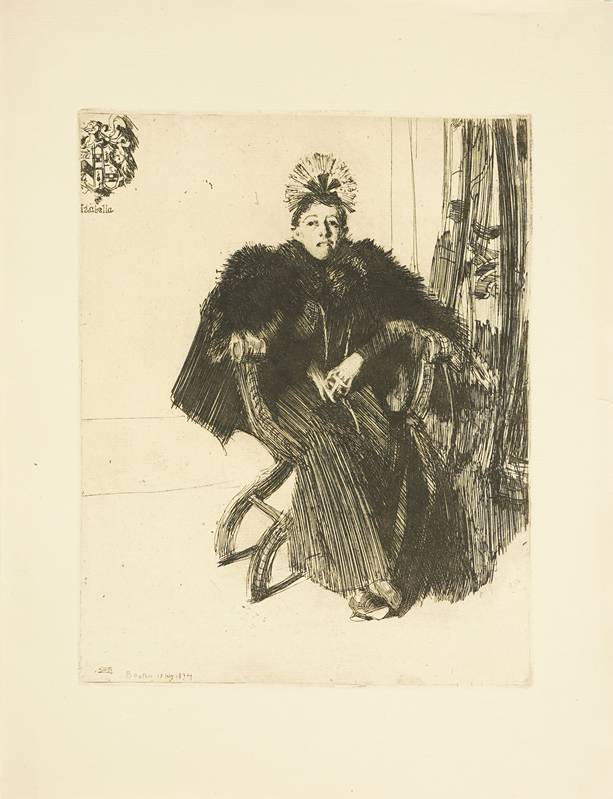1860 Mora - 1920 ebd. "Isabella Stewart Gardner" 1894. Späterer Tiefdruck auf Bütten mit Wasserzeichen. Oben links im Druck mit Wappen und Bezeichnung "Izabella", unten links im Druck signiert, bezeichnet und datiert "Boston 18 ... 1894". Bildgröße ca. 22 x 17,6 cm, Blattgröße ca. 30,7 x 23,8 cm. Am Rand teils leicht knickspurig.