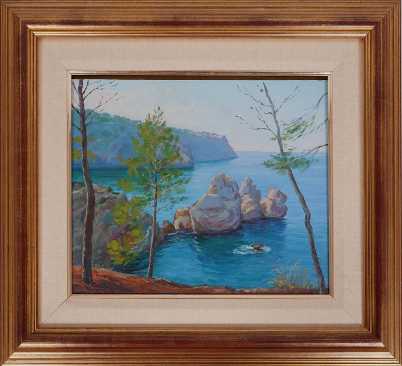Landschaftsmaler 20. Jh. Blick von oben auf eine Felsenküste und azurblaues Meer. Öl auf Leinwand. Signatur unten links. Größe ca. 37,5 x 46 cm, Rahmen ca. 63,5 x 71 cm. Bild ist lose im Rahmen.