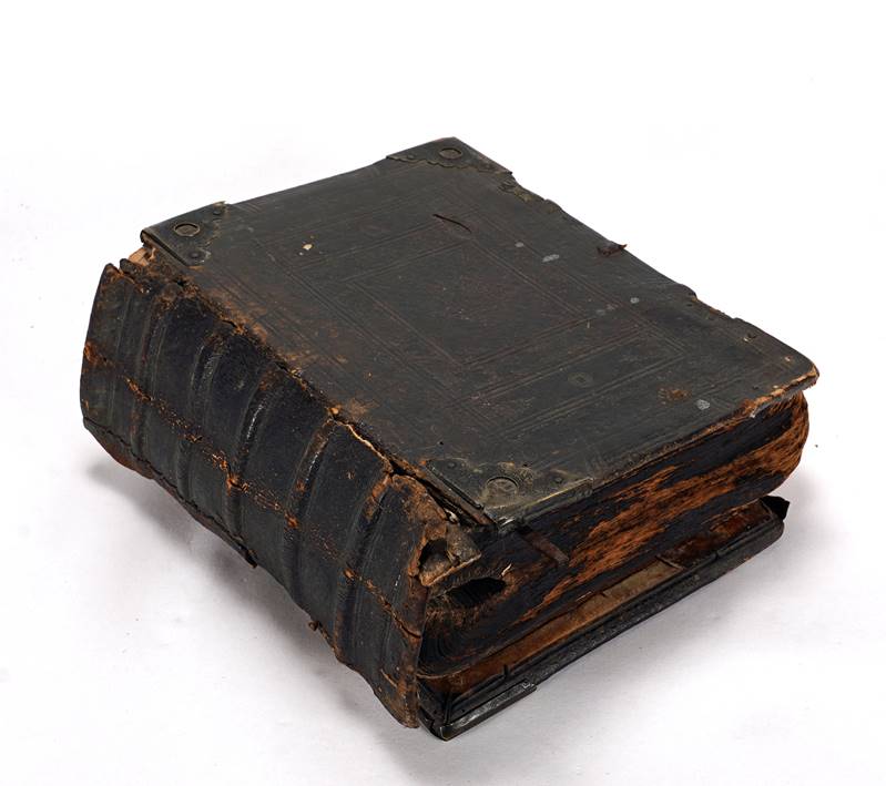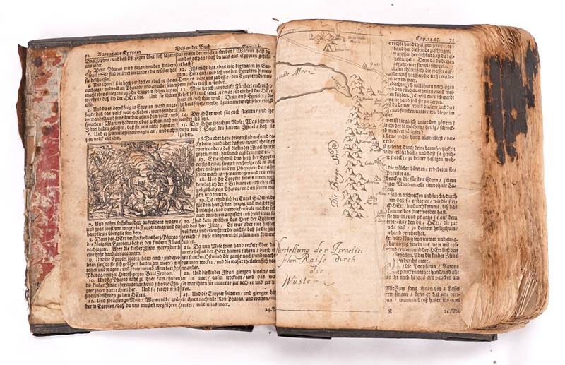 Wohl um 1690. Vorsatz fehlt wegen eines Brandschadens, entstanden während des 2. Weltkrieges. Schließt auf Seite 616 mit dem Ende des Hohen Liedes Salomonis. Beigebunden danach Die Propheten mit den Apocryphis verteutschet von H. Martin Luthern samt höchst-nützlichen Summarien und erbaulichen Figuren. Verlegts bei Hoffmann, Nürnberg. Altdorf gedruckt bei Jobst Wilhelm Kohles 1698, endet auf Seite 372, danach beigebunden Das Neue Testament veteutscht von Martin Luthern. Erschienen bei denselben im Jahr 1695. Endet mit der Offenbarung Seite (nicht zu lesen) ca. 254 (wohl nicht komplett). Holzdeckel mit 5 Bünden, geprägtes Leder und Metallecken. Starke Brandschäden, teils wohl Seiten fehlend.