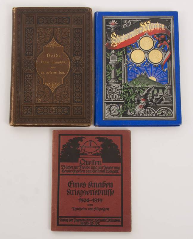 Wilhelm v. Kügelgen: Eines Knaben Kriegserlebnisse 1806-1814, C. Schnell München, Erstauflage. Guter Zustand. Johanna Spyri: Heidi, Gotha Perthes, 1883. Gebrauchsspuren. Karl Neumann-Strela: Hohenzollern-Märchen, Gramsch Berlin 1890.Gebrauchsspuren.