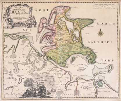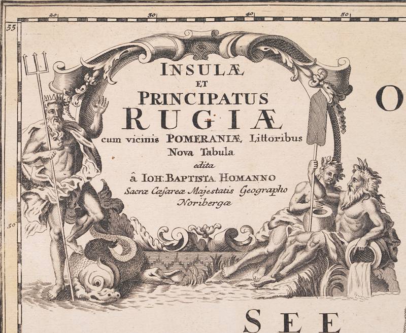 1664 Oberkammlach - 1724 Nürnberg. "Insulae et Principatus Rugiae cum vicinis Pomeraniae, Littoribus...". Eine Kupferstichkarte von Rügen um 1720. Mittig mit Bugfalz. Plattengröße ca. 49 x 58,9 cm. Teils restauriert.