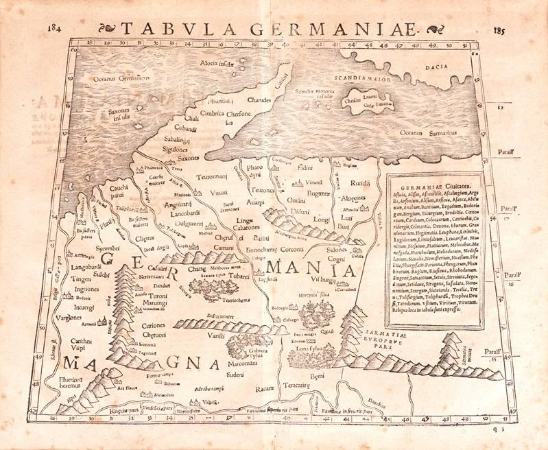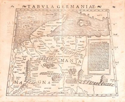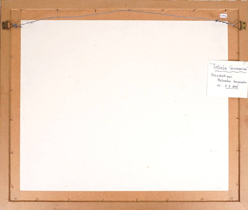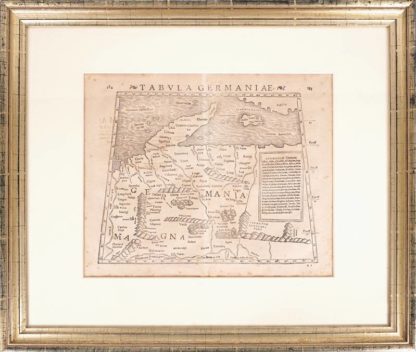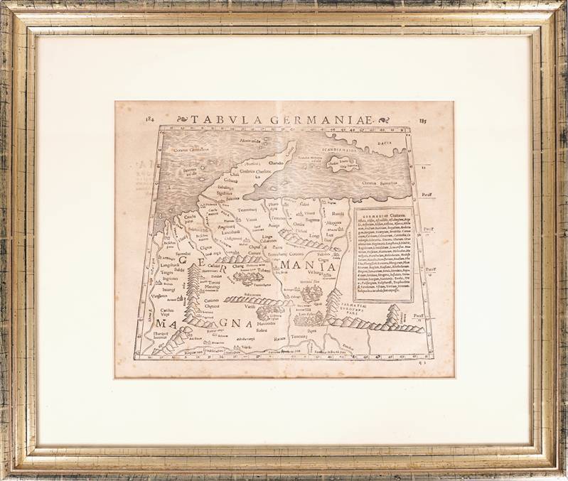 Münster, Sebastian 1488 Nieder-Ingelheim - 1552 Basel. Holzschnitt. "Tabula Germaniae", wohl aus "Geographiae Claudii Ptolemaei Alexandrini, Philosophi ac Mathematici...". Heinrich Petri, Basel um 1550. Mit Bugfalte. Hinter Passepartout und Glas gerahmt, ungeöffnet. Größe des Drucks ca. 270 x 330 mm, Rahmen ca. 52 x 61,5 cm. Mit Stockflecken.