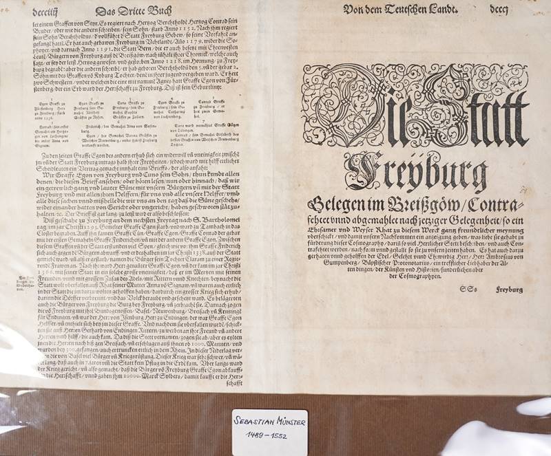 1525 Erlach - 1571 Morsee/Bern. Freiburg im Breisgau. Kolorierter Holzschnitt. Verso mit Beschreibung der Stadt Freiburg. Aus der deutschsprachigen Ausgabe der "Cosmographei" von Sebastian Münster, wohl Basel 1550. Passepartoutausschnitt ca. 27 x 39 cm, hinter Glas und Passepartout gerahmt ca. 41 x 53 cm. Rückseite mit durchsichtiger Folie. Blatt mit Bugfalz.