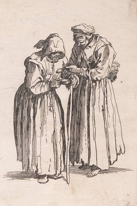 Callot, Jaques 1592 Nancy - 1635 ebd., nach. Zwei Radierungen. Aus der Folge Les Gueux/ Die Bettler. Jeweils beschnitten und auf Trägerblatt geklebt. Jeweils hinter Glas gerahmt. Rahmen je ca. 19,5 x 14,2 cm. Beschnitten, teils stockfleckig, teils am Rand eingerissen. Bitte besichtigen sie selbst.