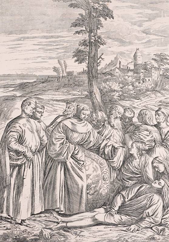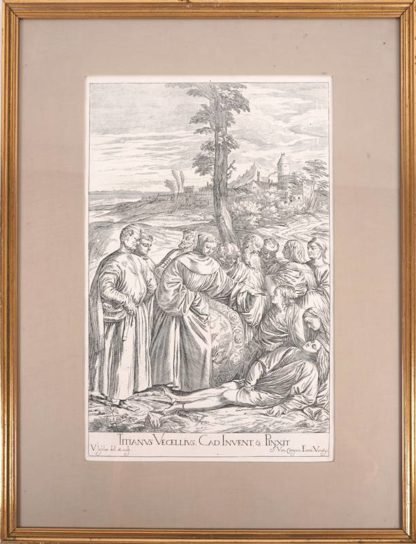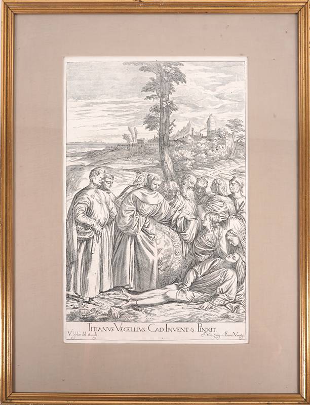 Tiziano Vecellio, nach Venedig 18. Jh. Radierung von Valentin Lefebre nach Tizians Gemälde "Wunder des heiligen Antonius von Padua", auf Bütten, herausgegeben von Van Campen. Unten mit Urheber, Radierer und Herausgeber bezeichnet. Wohl Nachdruck des 18. Jh. Größe der Platte ca. 42,3 x 27,4 cm, Blattgröße ca. 51,3 x 36,4 cm, hinter Passepartout und Glas gerahmt ca. 60 x 46 cm. Teils mit Knicken, lichtrandig und fleckig.