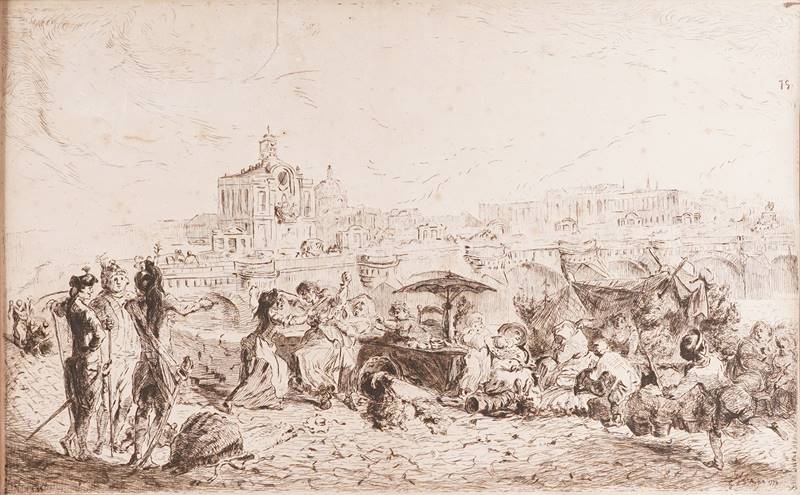 1736 Paris - 1807 ebd. Radierung, 1775. Blick auf Paris. Im Vordergrund Händler und Vagabunden. Im Mittelgrund die Seine und eine große Brücke mit Bögen. Im Druck unten rechts signiert und datiert. Oben rechts am Rand im Druck monogrammiert J.G. Unten links im Druck nummeriert 5 59. Verso auf dem Karton bezeichnet. Auf einen Karton montiert, hinter Passepartout und mit Rahmen (Berliner Leiste). Größe des Drucks ca. 22,5 x 37 cm, Rahmen ca. 38 x 52 cm. Blatt teils beschädigt und mit Stockflecken. Bitte besichtigen sie selbst.
