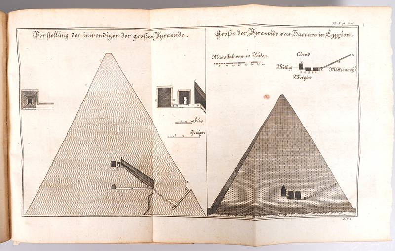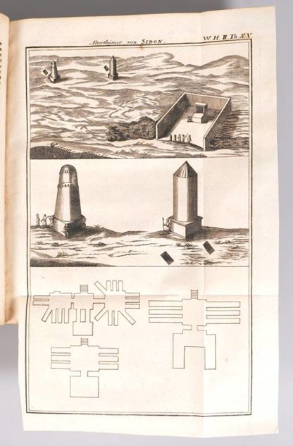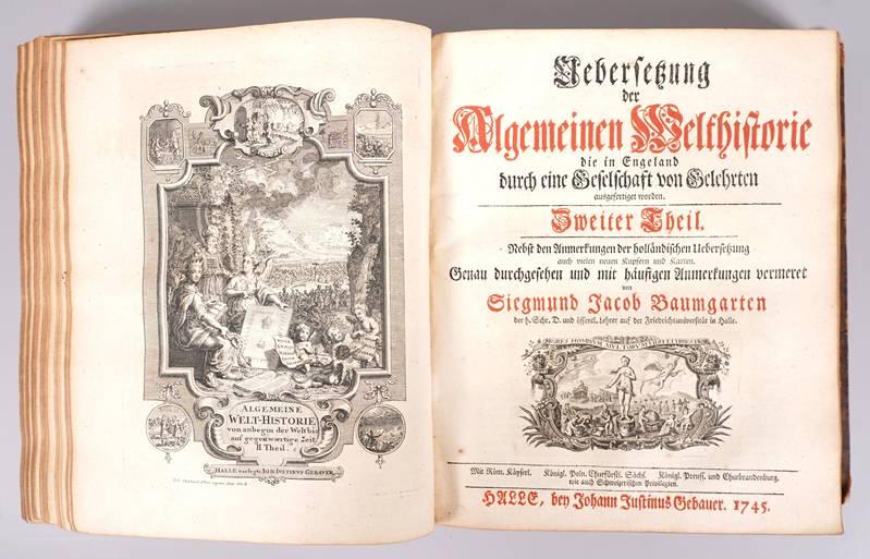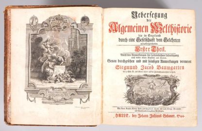 die in England durch eine Gesellschaft von Gelehrten ausgefertigt worden. Anmerkungen von Siegmund Jacob Baumgarten. Erster und zweiter Teil. Halle, Johann Justinus Gebauer, 1744/45. Insgesamt mit ca. 28 Kupferstichen inklusive Frontispitz, Titelkufper und 19 Faltkarten bzw. -ansichten. Über fünf Bünden im Ledereinband. Zustand wie abgebildet, nicht kollationiert.