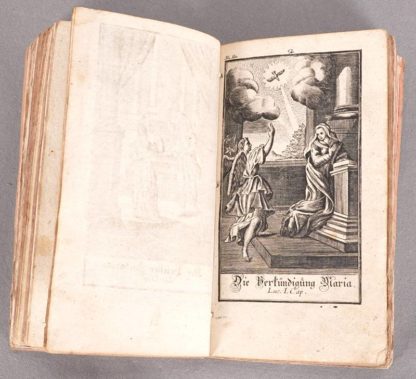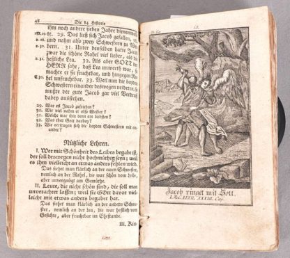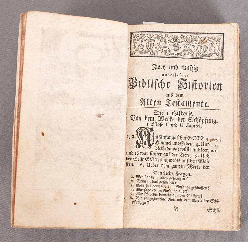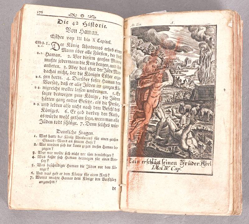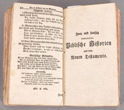 Hübner, Johann 104 Saubere Kupfer zu Hrn. Johann Hübners Biblischen Historien. Monath, Nürnberg 1762. Bestehend aus zwei Kapiteln "Zwey und fünfzig Biblische Historien aus dem Alten Testament" und "Zwey und fünfzig Biblische Historien aus dem Neuen Testament". Jeweils mit zahlreichen Kupferstichen. Altersbedingter Zustand. Einband ist nicht aus der Zeit. Nicht kollationiert.