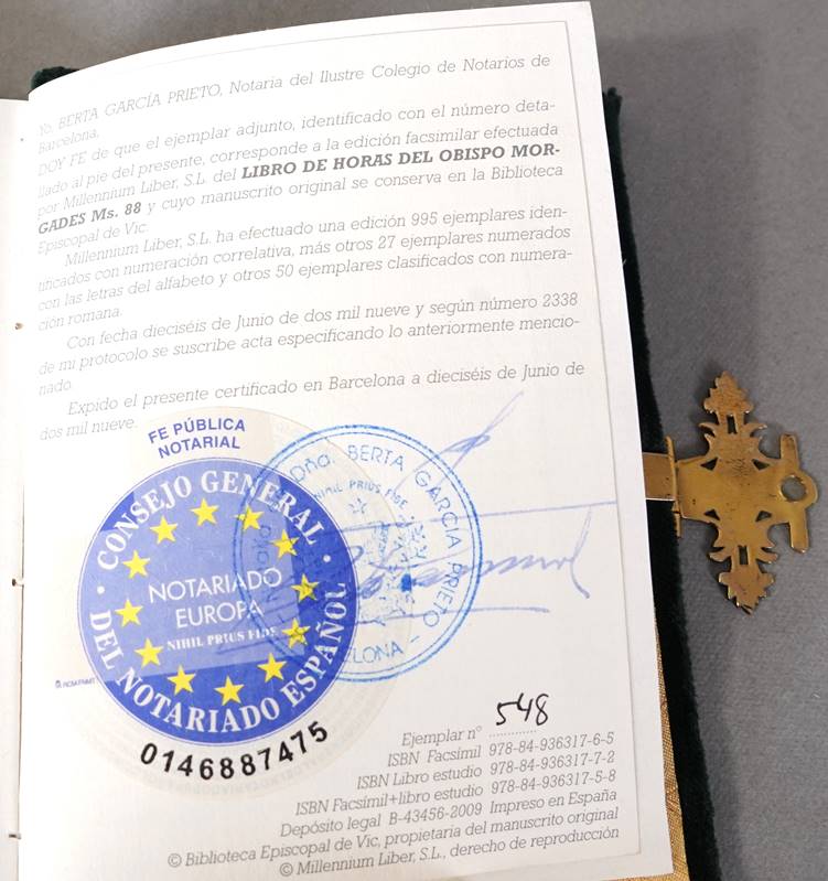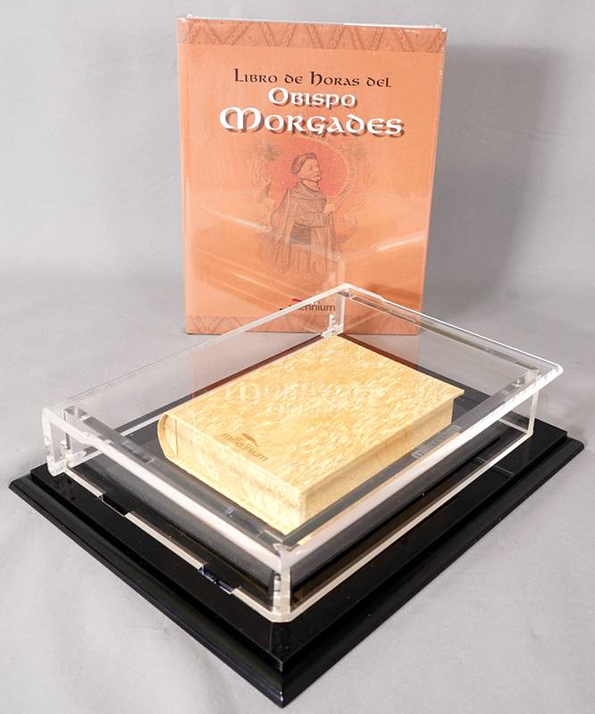Stundenbuch des Bischofs Morgades Beim Libro de horas del Obispo Morgades handelt es sich um ein Kompendium verschiedener Manuskripte aus dem 15. und 16. Jh. Faksimile Ausgabe in besticktem Samteinband, in Seidenkassette im Schaukasten mit Begleitbuch. Herausgegeben im Liber Millennium Verlag 2009, limitierte Auflage, hinten im Buch nummeriert. Größe des Schaukastens ca. 35 x 28 cm, Höhe ca. 9 cm.