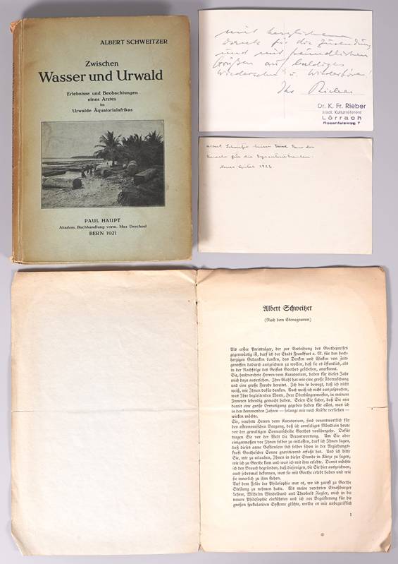 Dabei ein Essbesteck von Schweizer. welches ein Geschenk an Professor Franz Philipp war, dem Buch "Zwischen Wasser und Urwald" mit eingeklebter Widmung und Signatur, einer Abschrift Schweizers Ansprache zur Verleihung des Goethepreises mit Widmung, Signatur und Datum 23.4.29 sowie diverse Fotografien und Postkarten, teils ebenfalls mit Signatur. Länge des Löffels ca. 21 cm. Messer an der Spitze bestoßen.