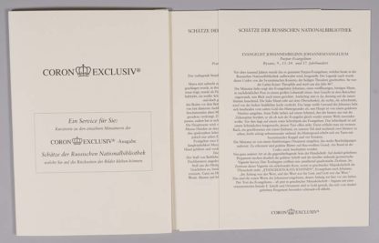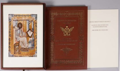 Schätze der Russischen Nationalbibliothek. 1000 Jahre Buchmalerei. Coron bei Kindler, Berlin 2007. Rote Lederkassette mit montiertem goldenem Adler sowie reicher vergoldeter Verzierung. Mit Beiheft. Größe ca. 45 x 33,5 cm.