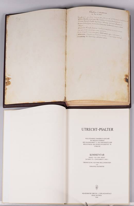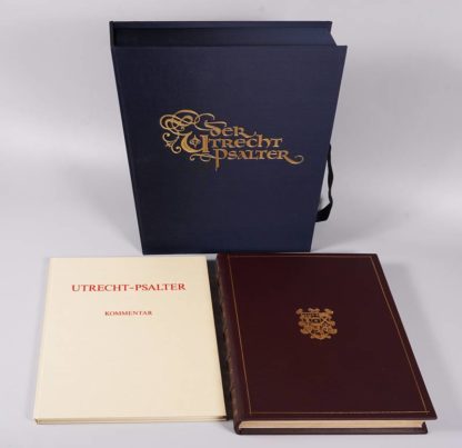 Utrecht-Psalter Vollständige Faksimile-Ausgabe im Originalformat der Handschrift 32 aus dem Besitz der Bibliothek der Rijksuniversiteit te Utrecht. Faksimile und Kommentar von Koert van der Horst & J.H.A. Engelbregt in 2 Bdn. Übersetzung des Kommentarbandes v. J. Rathofer. Graz, Akademische Druck- und Verlagsanstalt 1984. Zwei Bände in Originalschuber. 38 x 30 cm. Gewicht ca. 6,8 kg.