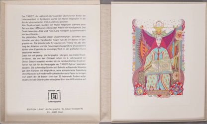 Wegmüller, Walter 1937 Bern - 2020 ebd. Tarot-Zyklus bestehend aus 24 Serigraphien gedruckt bei Edition Lanz. Je unten rechts signiert und datiert (19)73, unten links bezeichnet. In der Original leinenbezogenen Kassette ca. 62 x 50 cm.