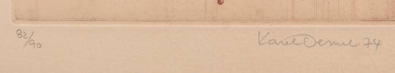Demel, Karel 1942 Prag. Surreale Szene. Radierung auf Bütten. Unten rechts signiert und datiert (19)74, unten rechts nummeriert 82)90. Größe ca. 26,8 x 25,6 cm, hinter Glas gerahmt ca. 53 x 40,5 cm.