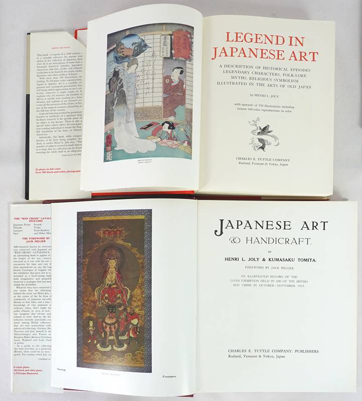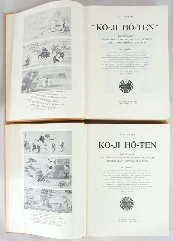 Ko-Ji Hô-Ten V.-F. Weber. Dictionnaire à l'usage des amateurs et collectionneurs d'objets d'art japonais et chinois. 2 Bände. Hacker Art Books, New York 1975. Erstausgabe 1923, Nachdruck von 1975. Dazu 11 diverse Bücher und Kataloge zu diversen japanischen Kunsthandwerken, auf deutsch und englisch. Darunter Die Koerperformen in Kunst und Leben der Japaner, C.H. Stratz (1924)/ Japanisches Kunstgewerbe, Bd. II, Feddersen (1960)/ Japanische Schwertzierate, Lumir Jisl (1967)/ Japanese Art & Handicraft, H. L. Joly & Kumasaku Tomita/ Legend in Japanese Art, H. L. Joly/ u.a. Gesamtgewicht ca. 17 kg.