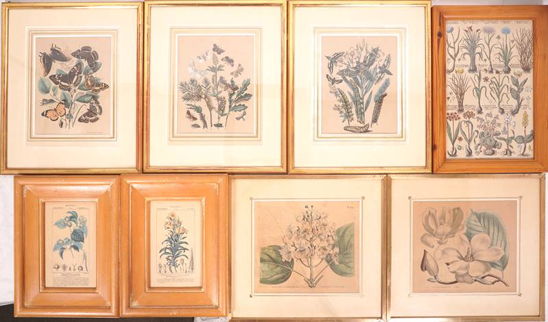 6 Stiche. Zwei botanische, kolorierte Kupferstiche von Sydenham Teast Edwards (c.1768-1819), jeweils publiziert bei Curtis 1808 und 1814. Je unten im Stich bezeichnet, oben nummeriert. Je mit zwei Bugfalten. Drei Drucke mit Schmetterlingen wohl nach Le monde des papillons : promenade à travers champs von Maurice Sand. Ein kolorierter Druck mit diversen botanischen Darstellungen, unten bezeichnet J.B. Morandi. Dazu zwei weitere botanische Offsetdrucke. Jeweils hinter Glas, teils auch hinter Passepartout gerahmt. Maximale Größe ca. 42 x 35 cm.