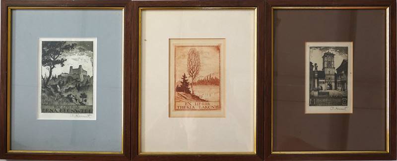 Kunst, Adolf 1883 - 1938 München. Drei Ex Libris Radierungen. Zwei unten rechts signiert, einmal im Druck bezeichnet. Maximale Größe hinter Passepartout und Glas gerahmt ca. 27 x 22 cm.