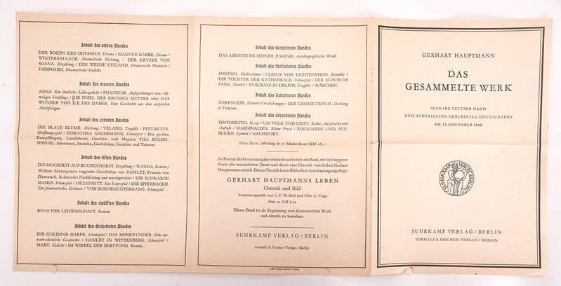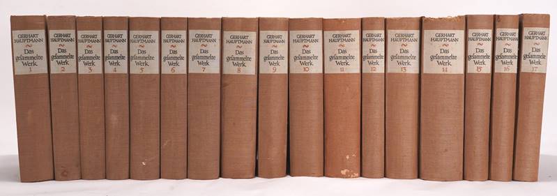 Das gesammelte Werk. Ausgabe letzter Hand zum Achtzigsten Geburtstag des Dichters am 15. November 1942. 17 Bände. Suhrkamp Verlag, Berlin. Handsigniert und datiert vom Autor. Weihnachten 1942 Gerhart Hauptmann. Leineneinband teils fleckig, teils leicht beschädigt. Bitte selbst besichtigen.