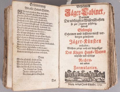 Kluger Haus-Vater, Verständige Haus-Mutter, Vollkommener Land-Medicus, Wie auch Wohlerfahrner Roß- und Viehe-Artzt ... Die Haushaltungs Kunst innerhalb 24. Stunden zu erlernen ... Weidmanns geheimes Jäger-Cabinet. Wiesewachs und Fischerey. Leipzig, Jacob Schuster 1729. Sechs Teile in einem Band. Mit gestochenem Frontispiz, mehrere Testholzschnitte. Erstmals 1685 erschienen. Des besseren Absatzes wegen wurde das Werk unter dem Namen des bekannten Johann Joachim Becher herausgegeben. Nach Lindner und Humpert stammt das Werk nicht von Becher. Ledereinband, teils beschädigt, ehemalige Schließen fehlen. Blätter teils fleckig, Stockflecken, aufklappbarer Holzschnitt abgerissen und fehlt zur Hälfte, diverse weiter Altersspuren. Nicht auf Vollständigkeit geprüft. Bitte besichtigen sie selbst.