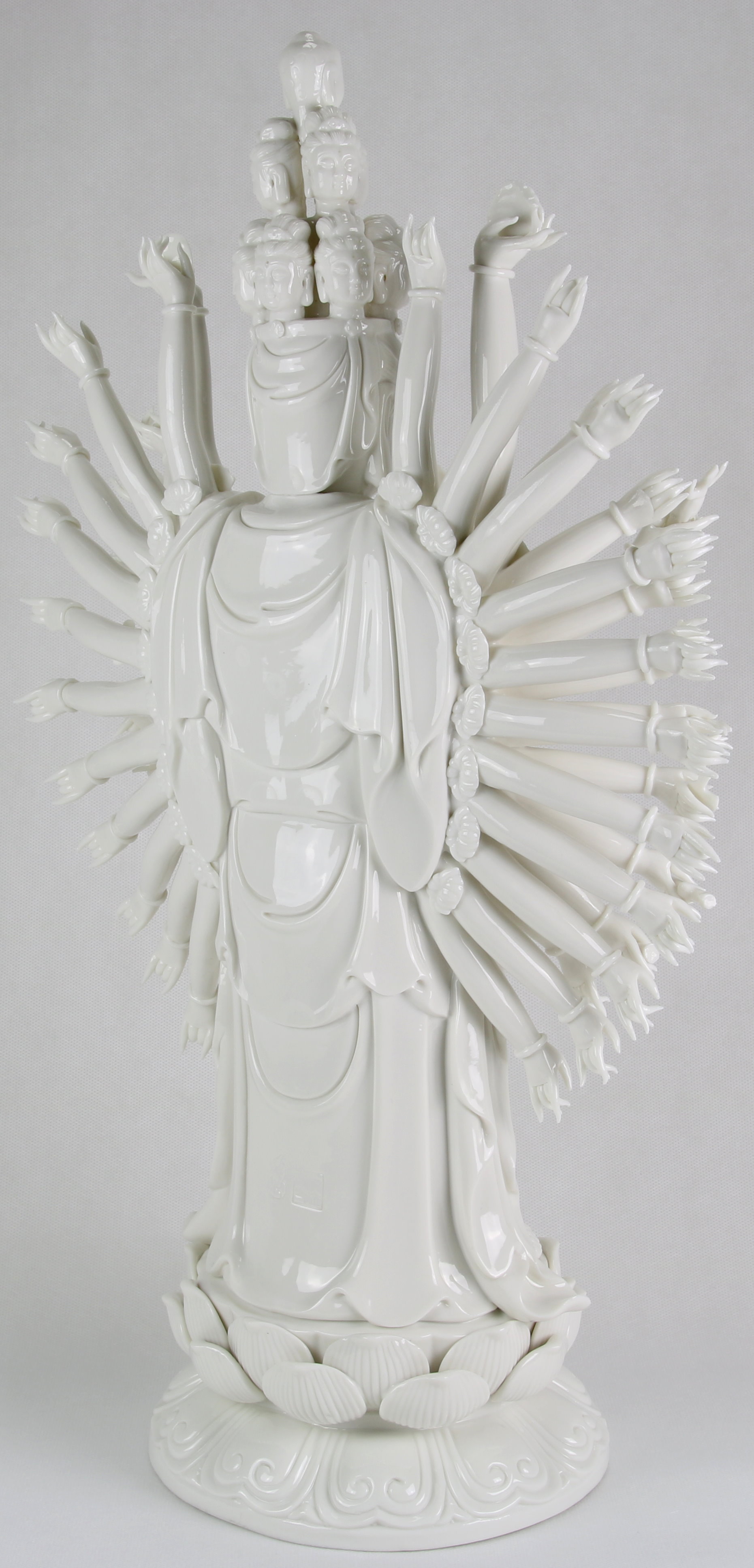 China, Dehua Porzellan 20. Jahrhundert. Avalokitesvara, Bodhisatva der Mitmenschlichkeit und Liebe. Hinten mit Künstlerstempel. Größe ca. 35 x 16 cm, Höhe ca. 52 cm.